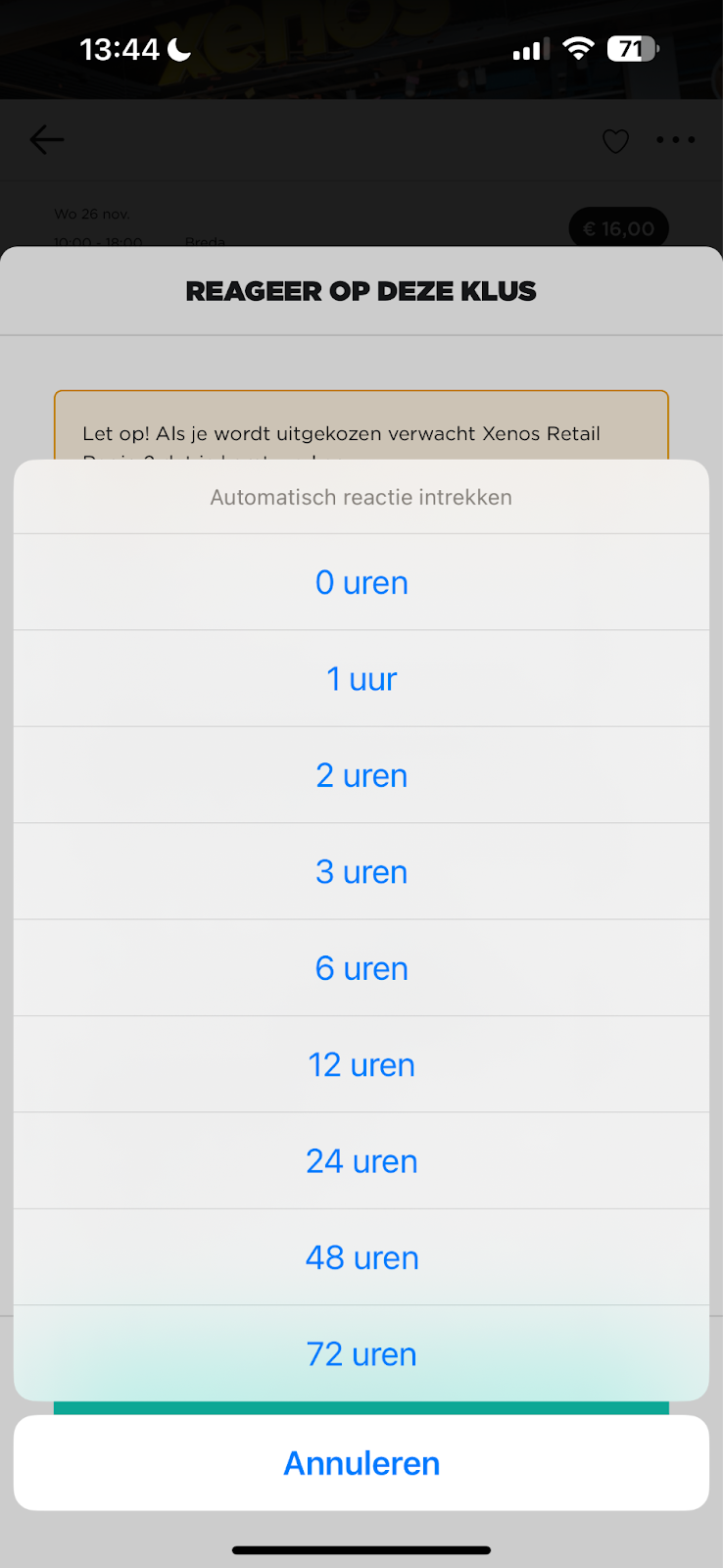 How it works: Suppose you apply for a gig on 1 January at 10:00. When applying, you choose ‘Automatically withdraw response’ and set it to 3 hours in advance. If you haven't heard back from the client by 07:00, the app will automatically withdraw your application. You can then no longer be picked for that gig.